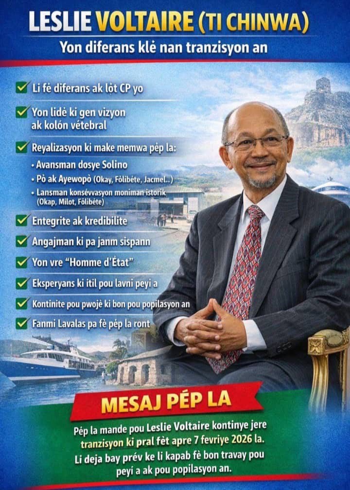 Leslie Voltaire, ignorant sa mauvaise gestion du MTPTC et les résultats médiocres des directions à sa disposition, aurait proposé un plan LAVALAS afin de se maintenir au pouvoir après le 7 février 2026. L’objectif de ce plan serait d’achever le prétendu mandat de 2004 d’Aristide, dans le but de consolider et d’harmoniser la coopération entre LAVALAS et la communauté internationale.