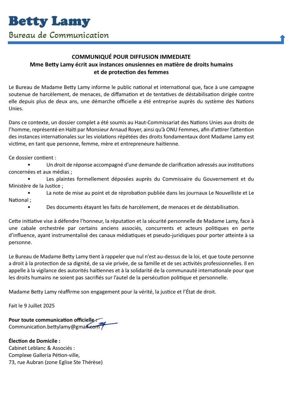 Le Bureau de Madame Betty Lamy tient à rappeler que nul n’est au-dessus de la loi, et que toute personne a droit à la protection de sa dignité, de sa vie privée, de sa famille et de ses activités professionnelles. Il en appelle à la vigilance des autorités haïtiennes et à la solidarité de la communauté internationale pour que les droits humains ne soient pas sacrifiés sur l’autel de la persécution politique et personnelle. Madame Betty Lamy réaffirme son engagement pour la vérité, la justice et l’État de droit.