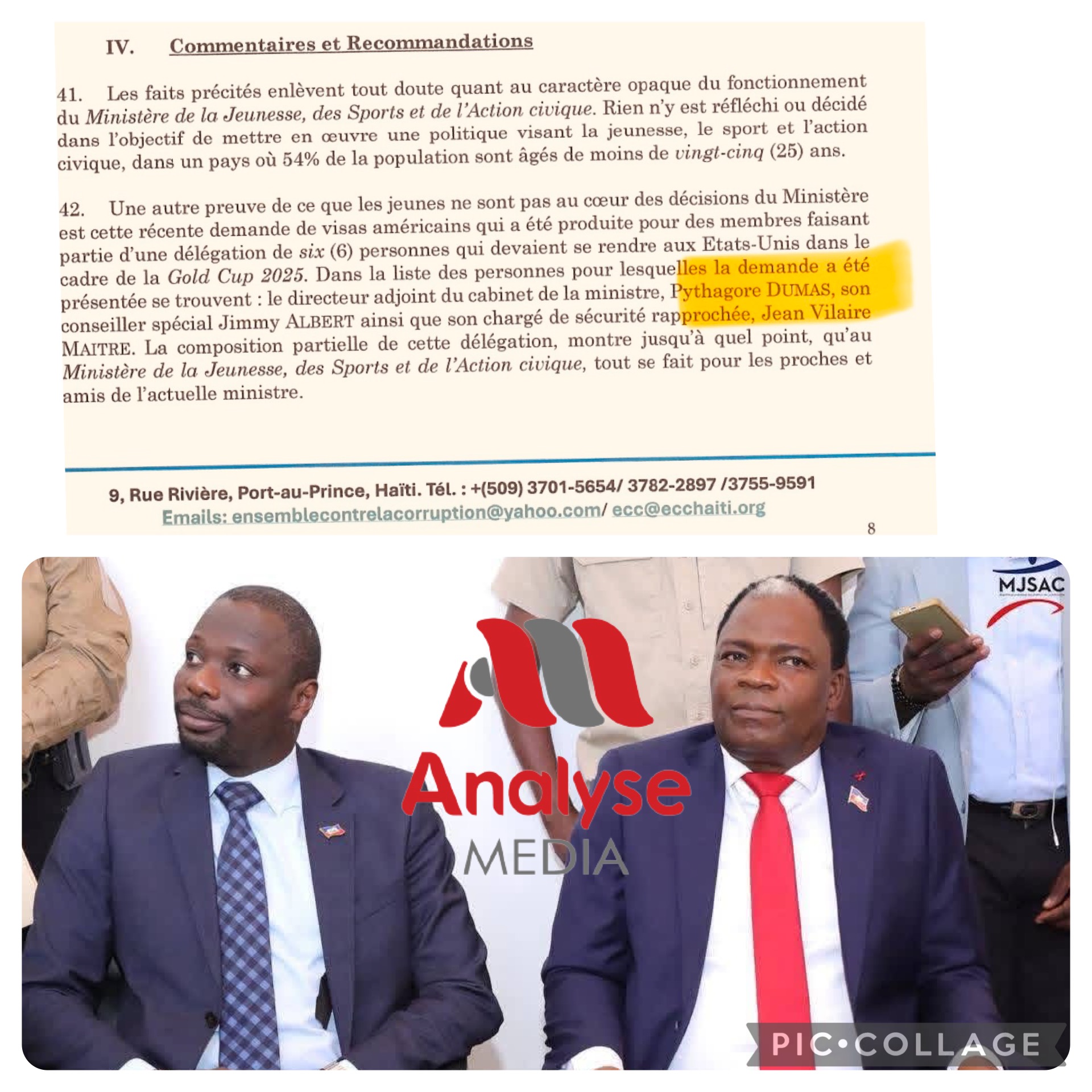 Sans intimidation ni agitation, nous (Analyse Média) tenons à féliciter et à souhaiter la bienvenue à Dumas Pythagore en terrain connu. Toutefois, nous lui demandons de clarifier sur les RÉSEAUX SOCIAUX la page 8 du document de l’Ensemble contre la corruption (ECC) : le MJSAC croule sous la corruption, datée du 3 juillet 2025.